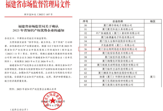 近日,,,福建省市场监督管理局公示了2023年福建省知识产权优势企业名单,,,厦门亚星管理网络技术股份有限公司(以下简称“亚星管理”或“公司”)榜上有名。。